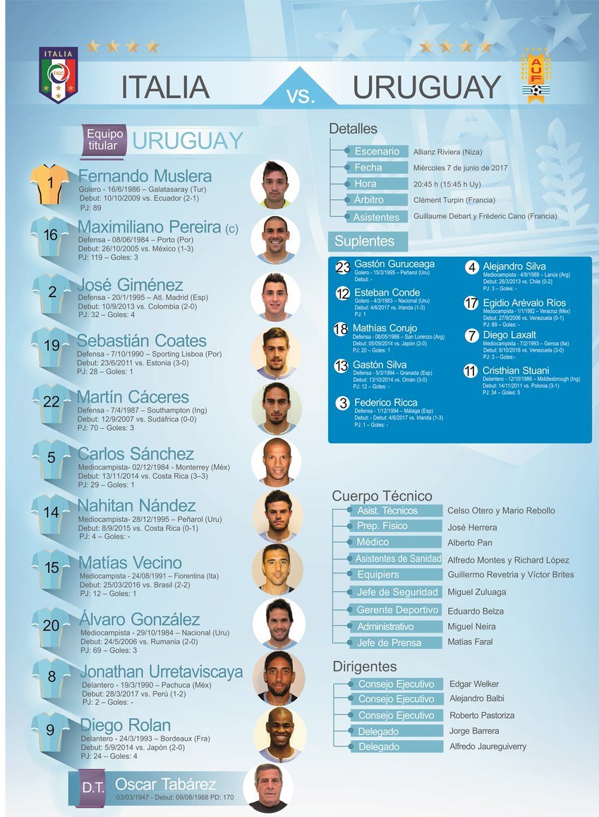 Uruguay dio a conocer a sus 11 titulares para el duelo ante Italia en Niza.